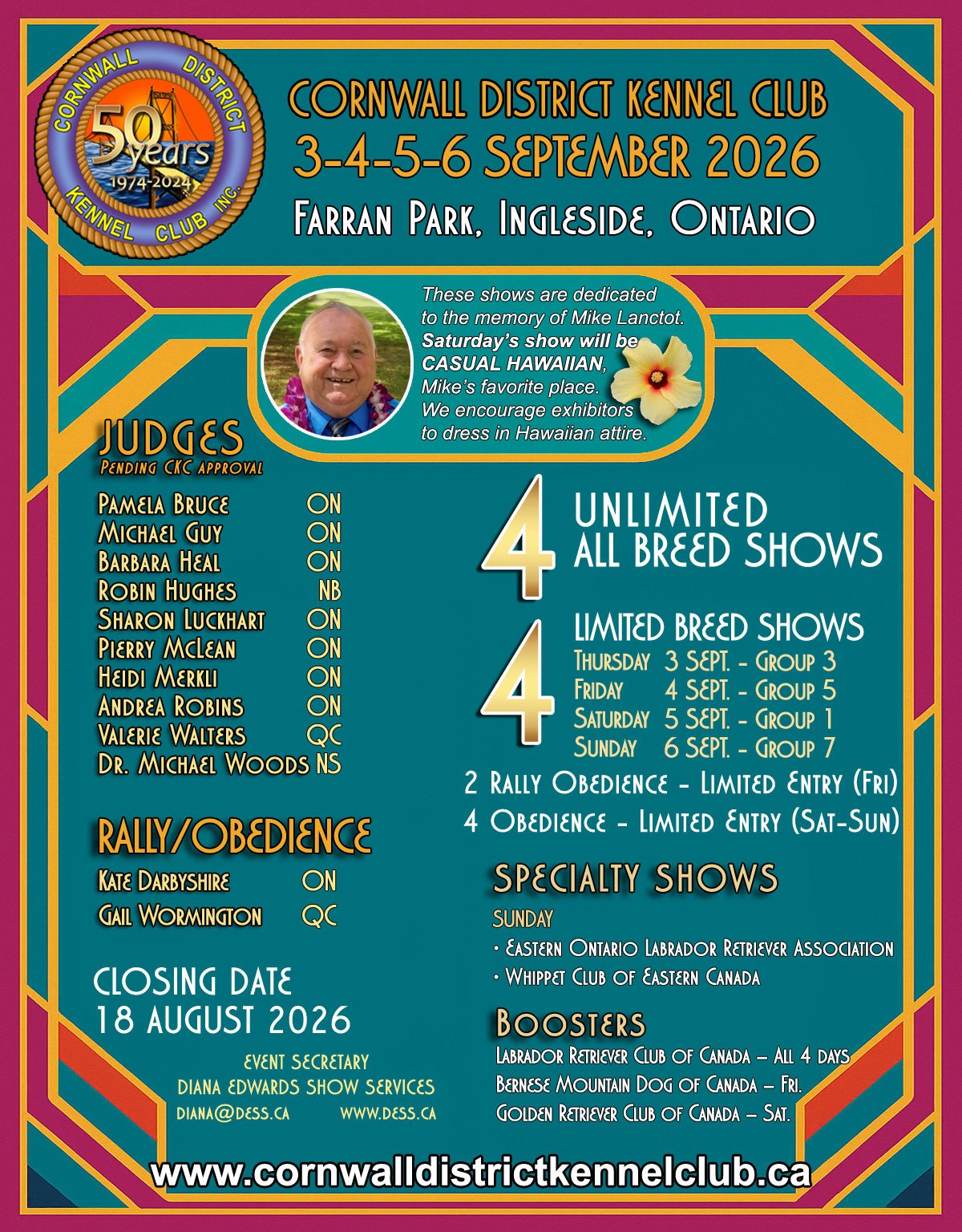 6. Our annual 4 All Breed Championship Dog Shows will be held during the Labour Day weekend beginning on the Thursday preceeding Labour Day and ending the Sunday of Labour weekend.